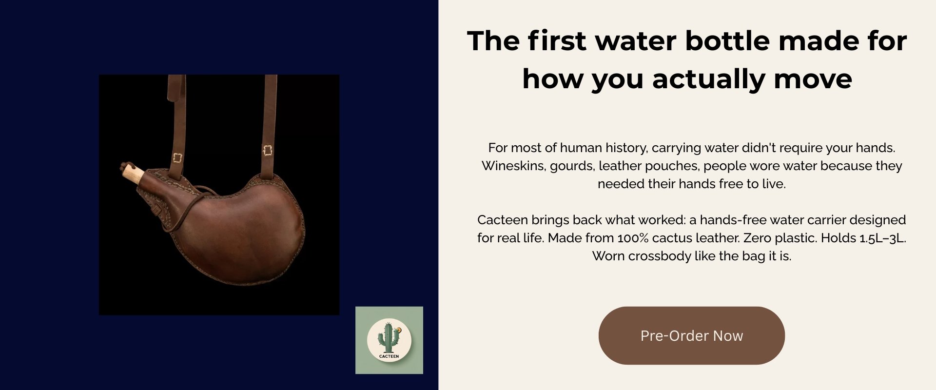 Bring back what worked: a hands-free water carrier designed for modern life. Cacteen combines ancient functionality (the wineskin) with modern values (zero plastic, cactus leather, accessible design). Worn crossbody like the bag it is. No plastic. No compromise.
